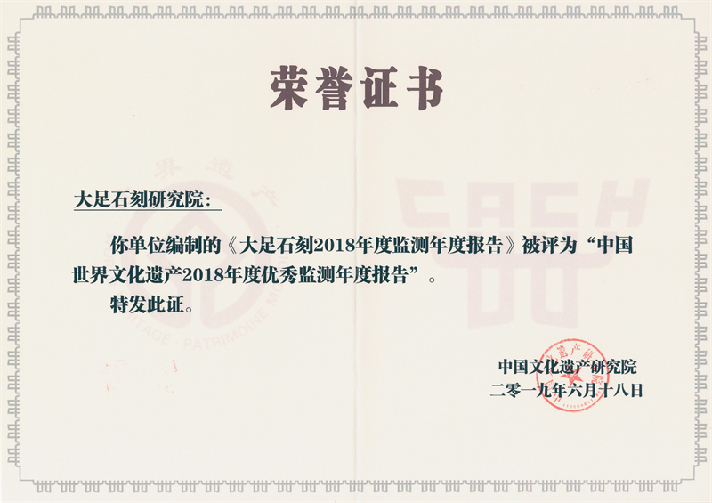 2019年6月18日—19日,中国世界文化遗产监测2019年年会于重庆大足召开。本次年会以“规范遗产监测、优化保护管理”为主题,由国家文物局、重庆市文物局、重庆市大足区人民政府指导,中国文化遗产研究院、大足石刻研究院共同主办。来自全国25个省市(自治区)及澳门特别行政区的文物管理机构代表、遗产地代表、世界文化遗产相关机构代表及专家共120余人参会。会上举行了优秀监测年度报告颁奖仪式(大足石刻、莫高窟、苏州古典园林、龙门石窟、鼓浪屿:历史国际社区、杭州西湖文化景观六项世界文化遗产的保护管理机构获此殊荣)。大足石刻研究院院长黎方银介绍了大足石刻世界遗产的保护管理和监测工作的情况。