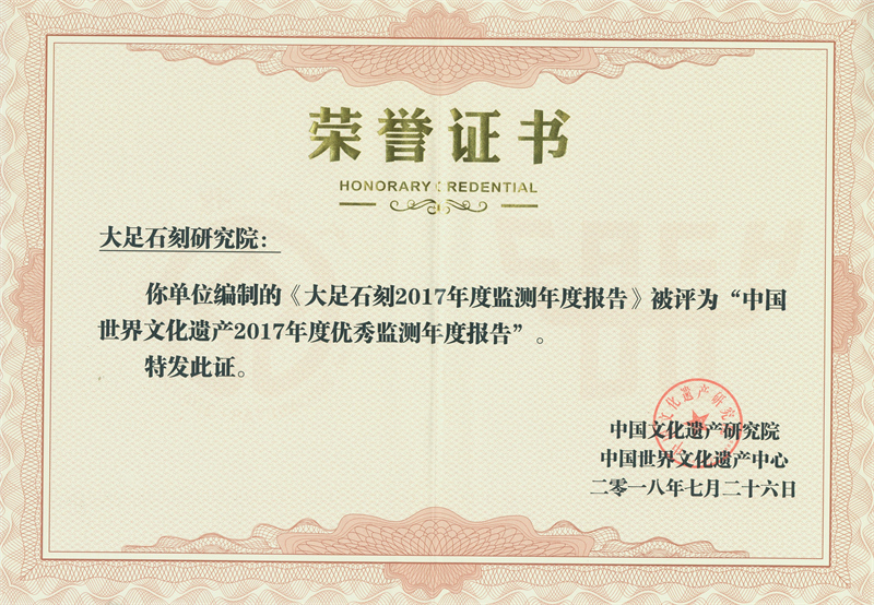 2018年7月26日,中国世界文化遗产监测2018年年会在厦门鼓浪屿举办。《大足石刻2017年度监测报告》荣获中国世界文化遗产2017年度优秀监测年度报告。
